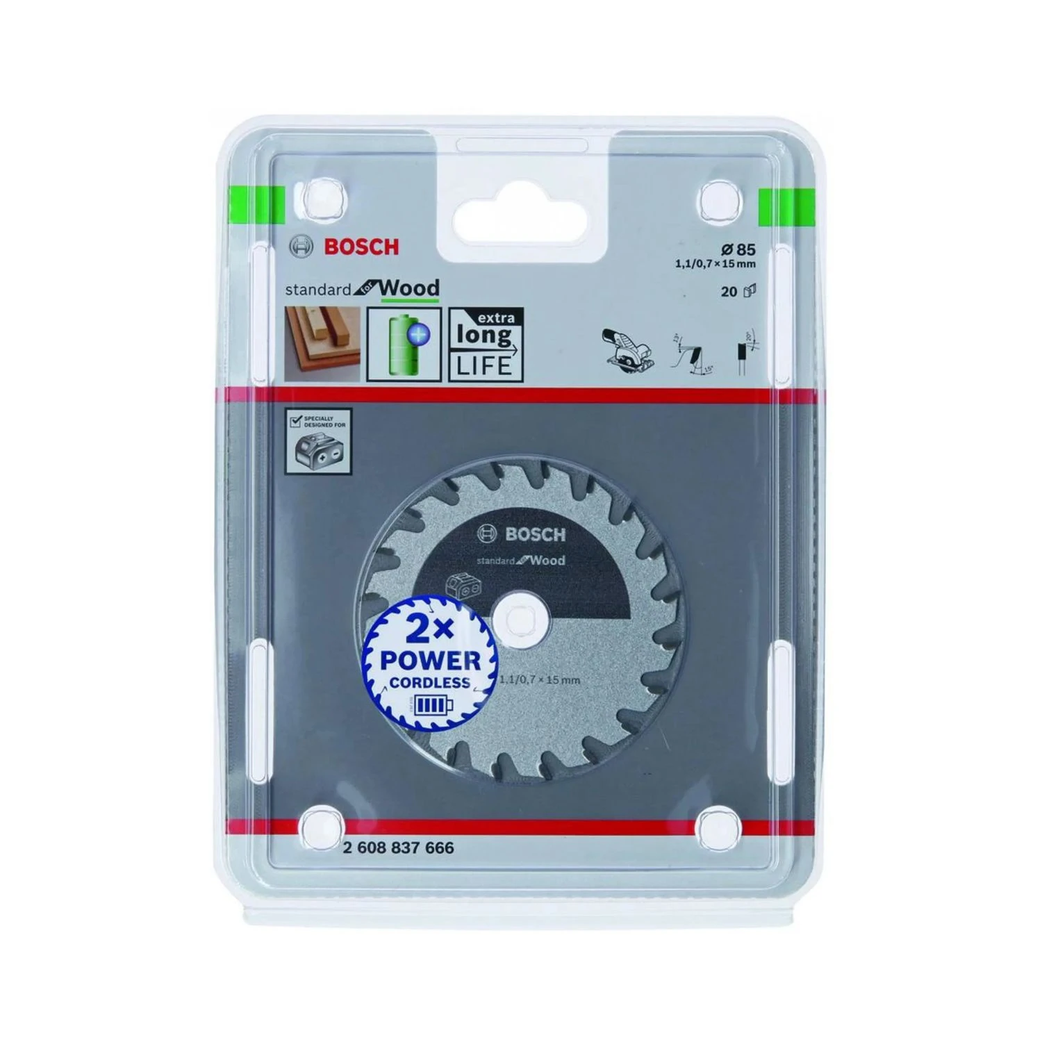 The Bosch 2608837666 Standard for Wood Circular Saw Blade for cordless saws and dry-cutters maximises battery runtime. The Standard for Wood Circular Saw Blade enables reliable cutting results thanks to its high-quality carbide teeth. Expansion slots notably reduce noise and heat while working.