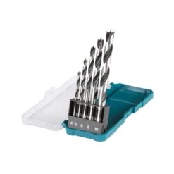 The Makita D-72861 is a 5 Piece Drill Bit Set with straight shanks, suited to drilling in Wood. The Set has 5 different sized Drills: 4, 5, 6, 8 and 10mm. They have Brad points, a central point and two raised spurs that help keep the bit drilling straight. The bit cuts timber very fast when used in a power drill and leaves a clean sided hole.