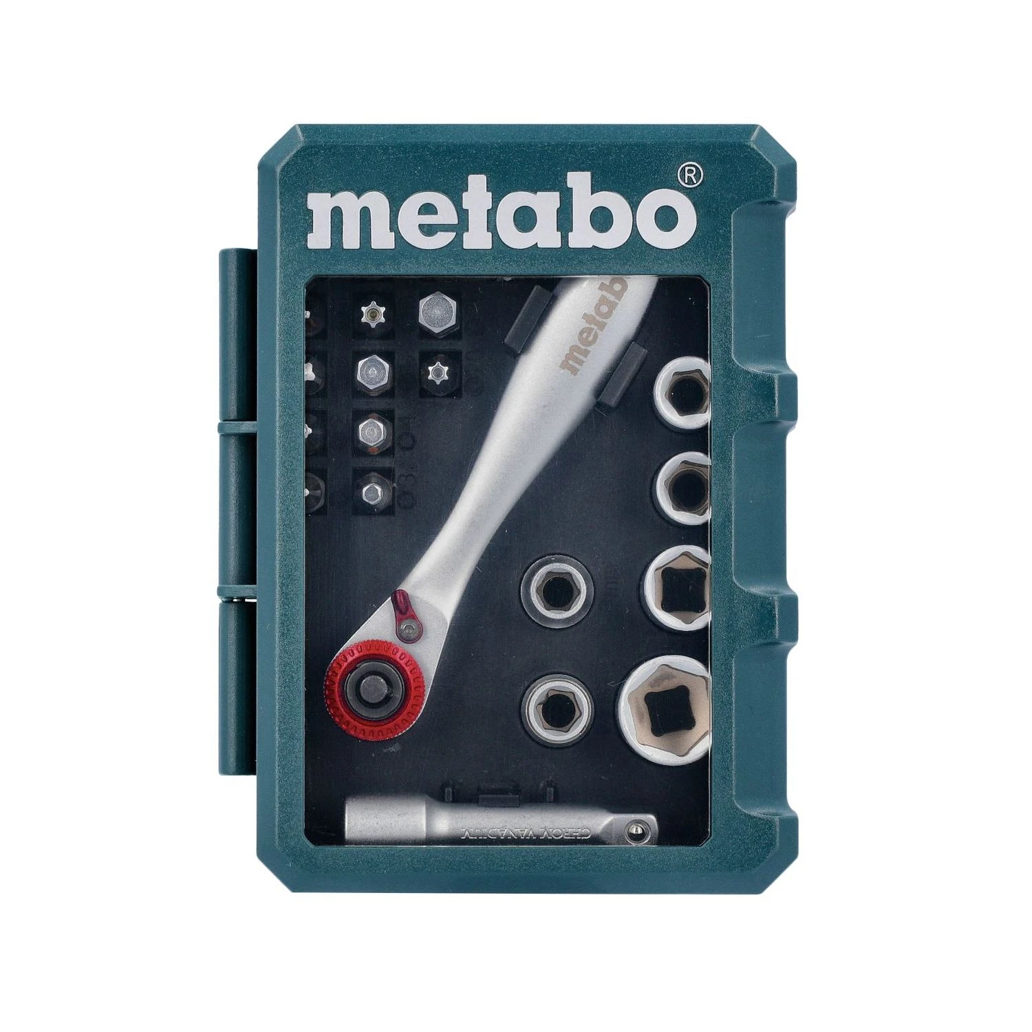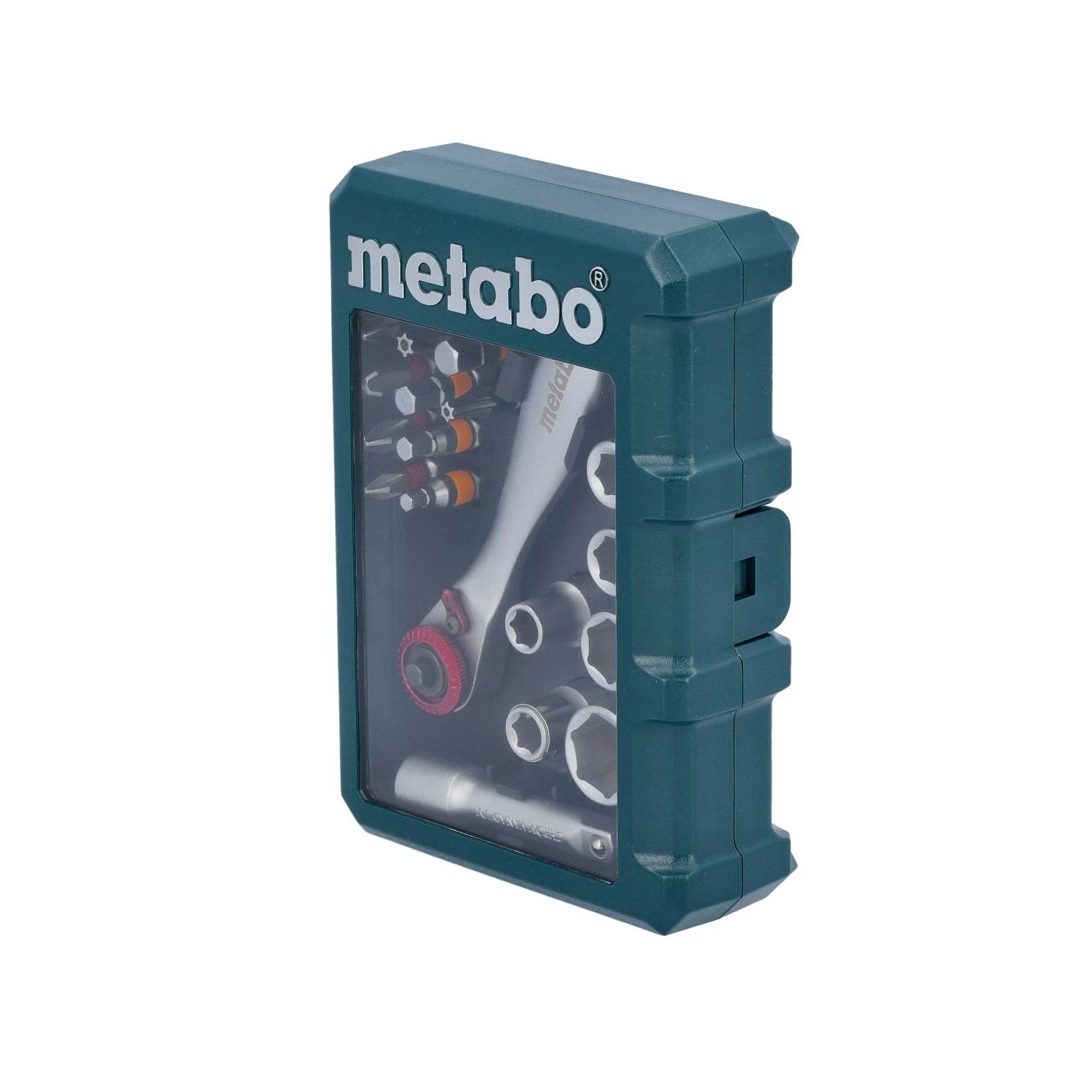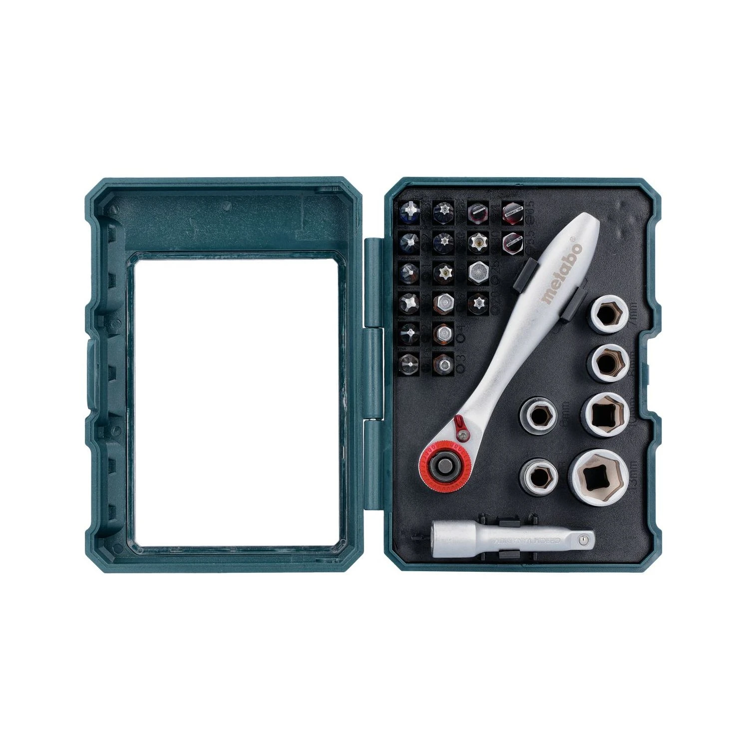 The Metabo 626701000 Bit-Box and Ratchet Set has 18 assorted bits and 6 sockets in sizes from 6mm to 13mm. Comes in a small handy storage box sized 125mm x 90mm x 30mm. Comes in a Metabo design robust box, with extendable Euro hole hanger.