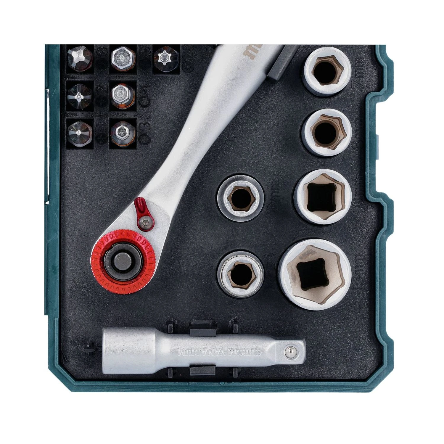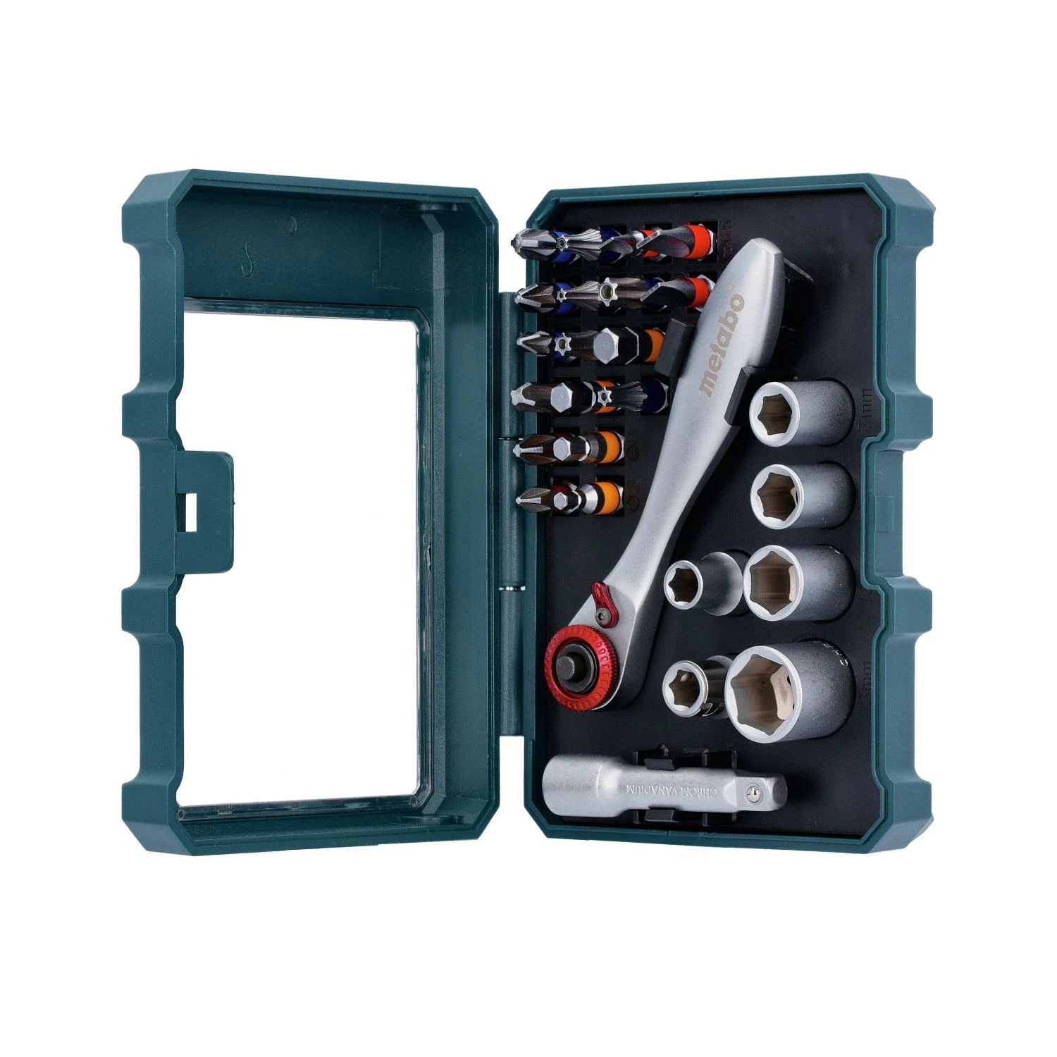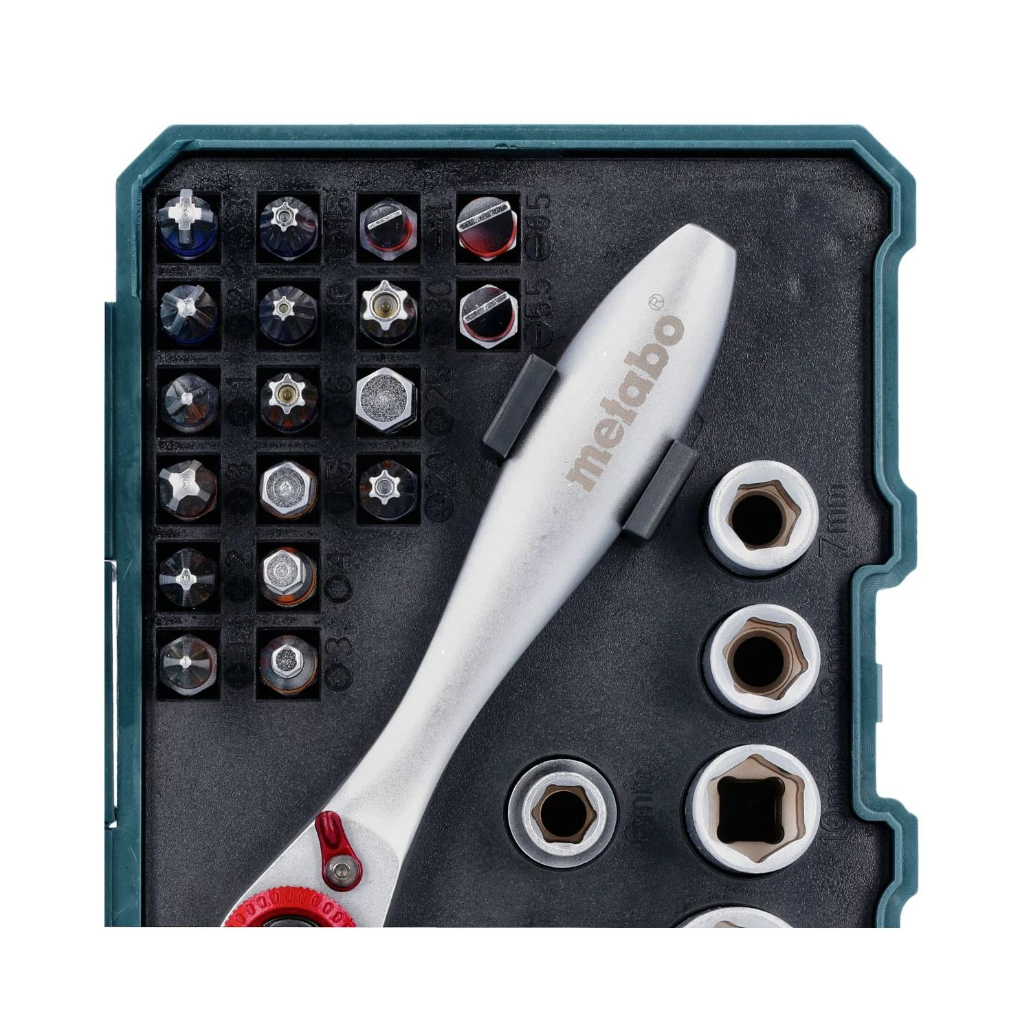 The Metabo 626701000 Bit-Box and Ratchet Set has 18 assorted bits and 6 sockets in sizes from 6mm to 13mm. Comes in a small handy storage box sized 125mm x 90mm x 30mm. Comes in a Metabo design robust box, with extendable Euro hole hanger.