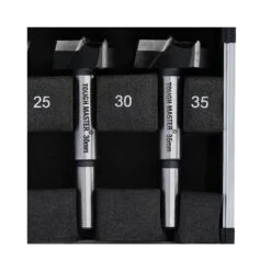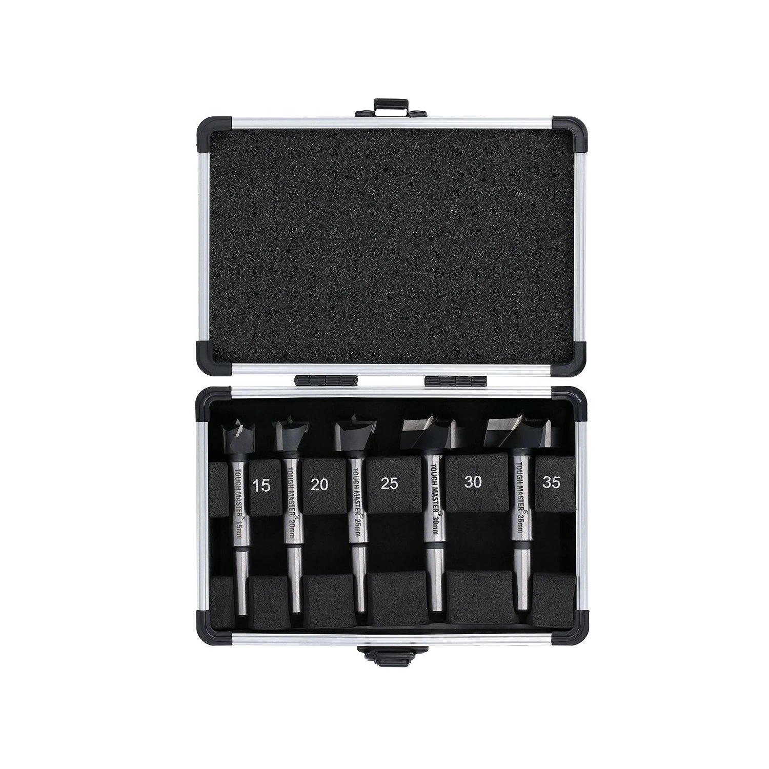 Whether you’re drilling hinge holes or want to drill some overlapping holes, you need a dependable set of Forstner drill bits. The best Forstner drill bits, like this Forstner bit set from TOUGH MASTER®, drill a flat-bottomed hole, cleanly and precisely, and with a minimum of tear-out or splintering. The TM-RB5F has the full set of commonly used Forstner drill bits sizes: 15mm, 20mm, 25mm, 30mm and 35mm. Our Forstner bits are made of C45 carbon steel with precision-engineered tungsten carbide cutting (TCT) edges. TCT cutting edges remain sharp, even at the high temperatures generated by high cutting speeds and feeds, thereby reduce machining cycle time. TCT cutting edges can also be resharpened, so these hinge hole cutters will give you a smooth, precise cut every time. This 5-piece Forstner bit set comes in its own sturdy aluminium case, so it’s easy to carry this hinge hole cutter set anywhere and store it safely, too. Each Forstner bit is labelled with its own size inside the case, making it easy to choose the correct bit. Plastic blade covers for each hinge hole cutter bit help prevent accidental injury.