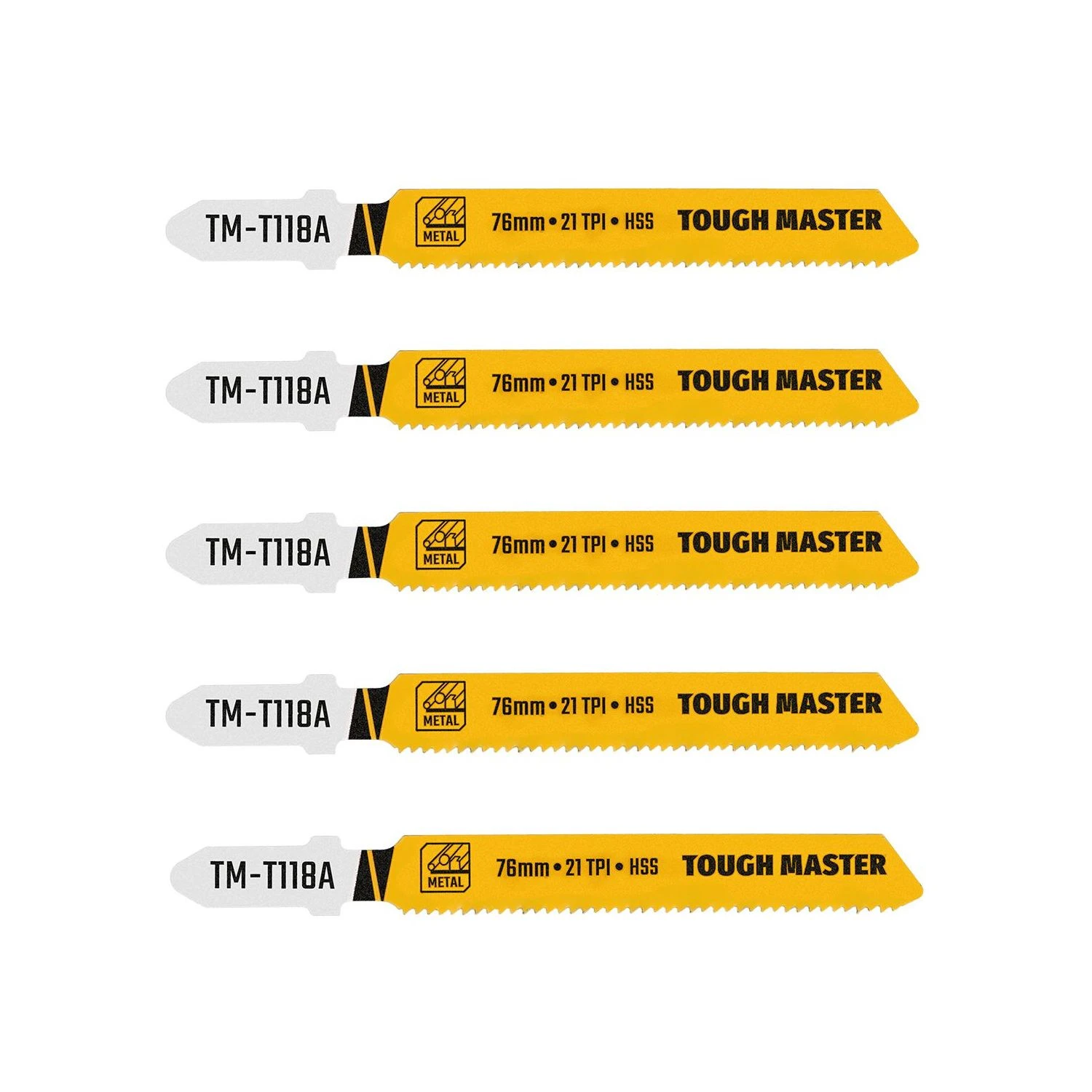 The TM-T118A is an excellent choice when it comes to Jigsaw Blade Sets. This 20 piece jigsaw blade set has been designed for metal but can also take on wood, PVC, drywall and nails. Its smooth 21TPI allows for smooth cuts when using the jigsaw blades, and can cut into a variety of thicknesses with a professional finish. These jigsaw blade types have been built to last, with a fully hardened, high-grade and high-speed steel construction that offers maximum durability. The jigsaw blades for metal and other materials fit all T-shank jigsaws to make swapping blades faster than ever, and grip firmly and securely, too. What’s more, milled, wavy-set teeth make for the perfect cuts that don’t require special requirements. When used with appropriate lubricant, the professional jig saw blades should last for an extended period of time and will remain in exceptional condition throughout their lifespan. These T shank jigsaw blades are packed in clear cards of 20 blades and named by industry-standard codes to make blade selection easy.