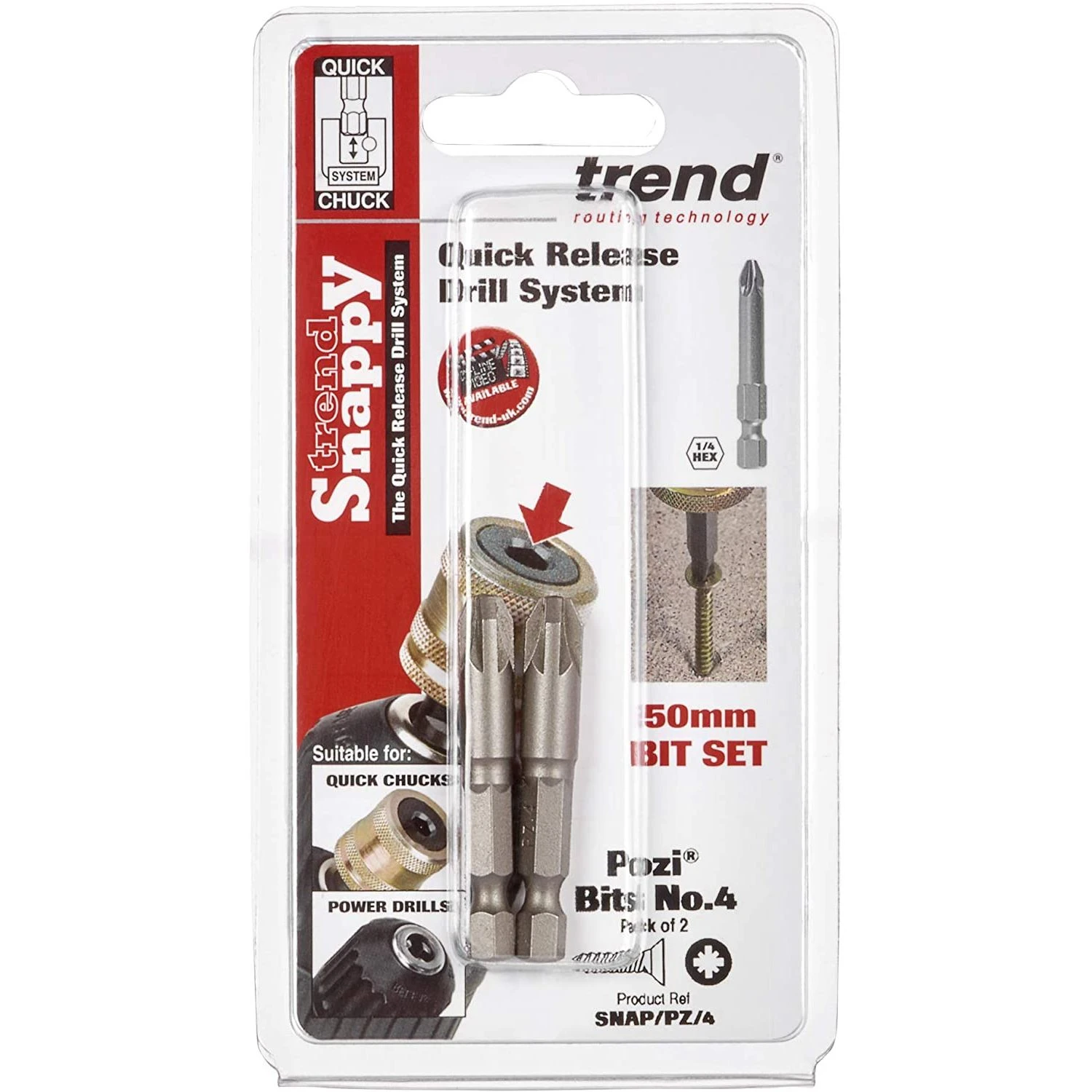 SNAP/PZ/4 Trend snappy Pozi No 4 50mm 2 Pack 50mm Pozi Bits Trend snappy screwdriver bits Pozi trend is a well established company that has been designing and developing router technologies since 1955 and during this time they have built a recognised brand with a strong reputation for high quality.