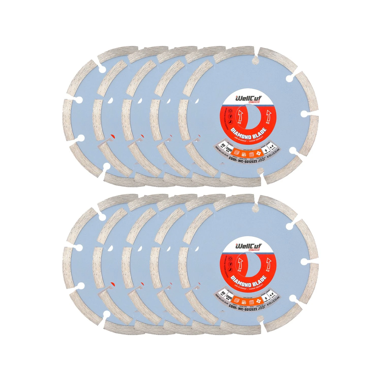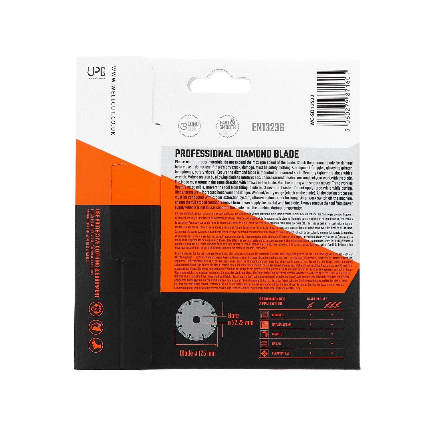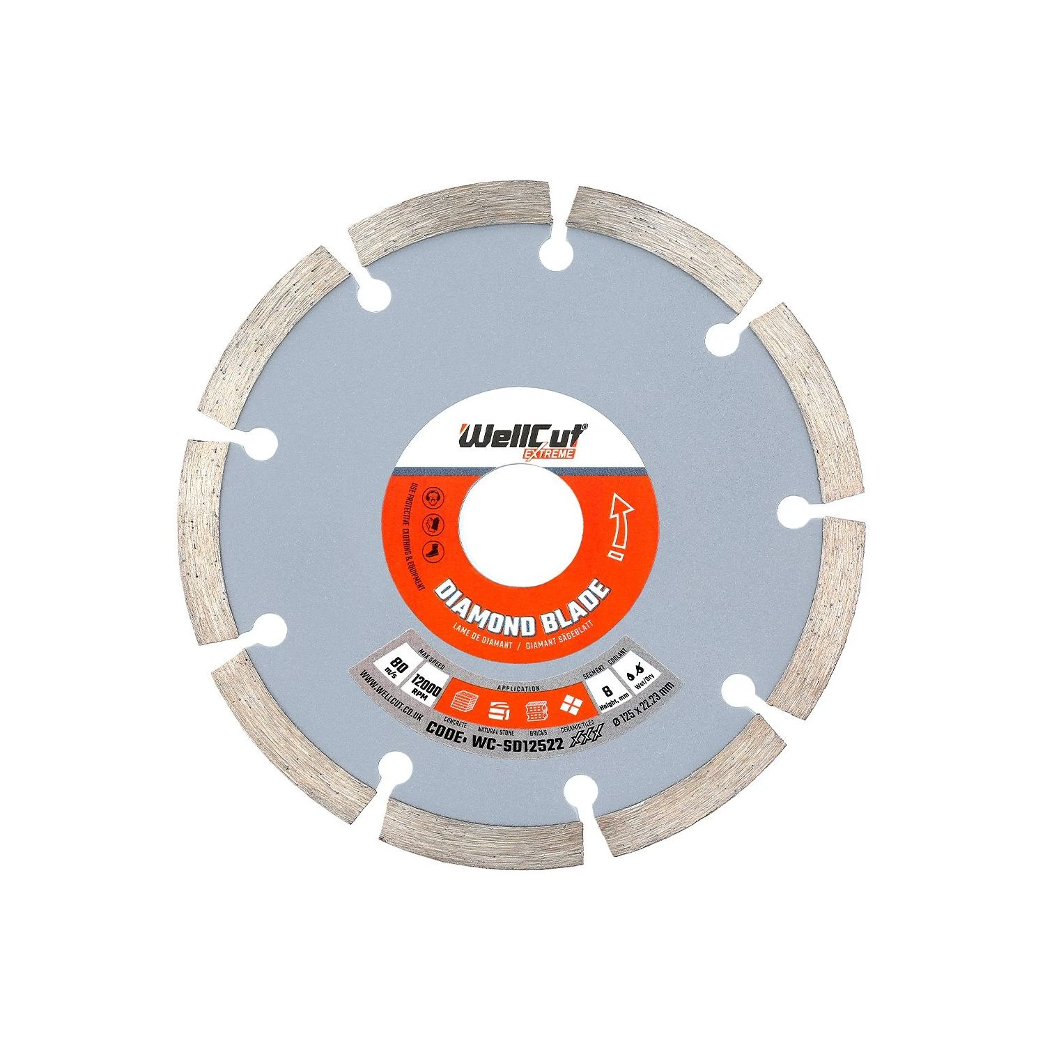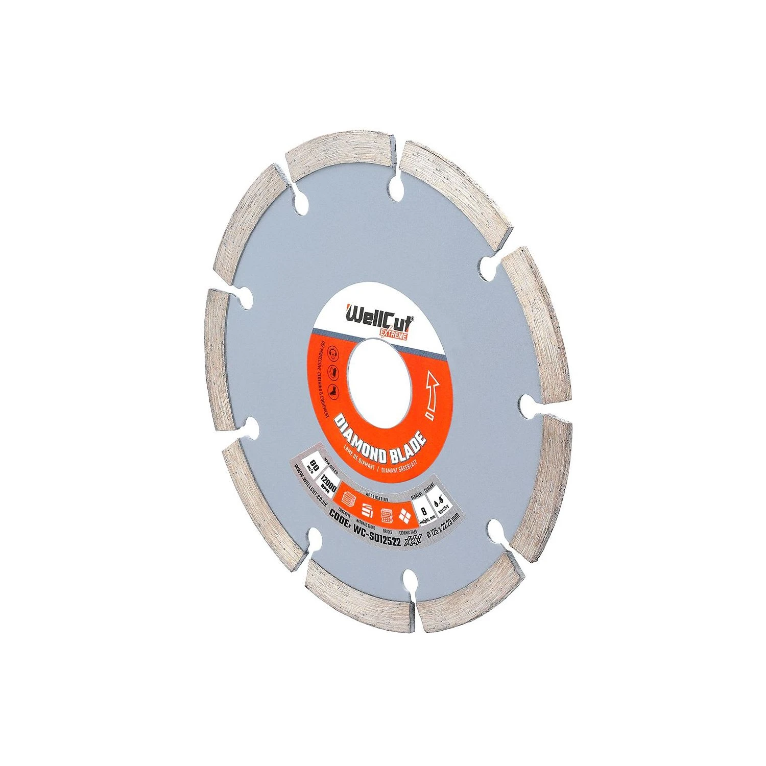 This diamond blade cutting disc is designed for use with most 125 mm angle grinders and is ideal for cutting hard materials such as concrete, natural stone, sandstone, granite, brick, limestone and pavement slabs, amongst others. Measuring 8mm thick with a 125mm diameter and 22mm bore, the disc features a series of grooves which make the action slightly more aggressive than smooth discs and also helps remove material from the cutting surface as you work. The diamond cutting segments are highly durable and ensure long life of the disc. Operational up to 12,000rpm and suitable for wet and dry cutting.