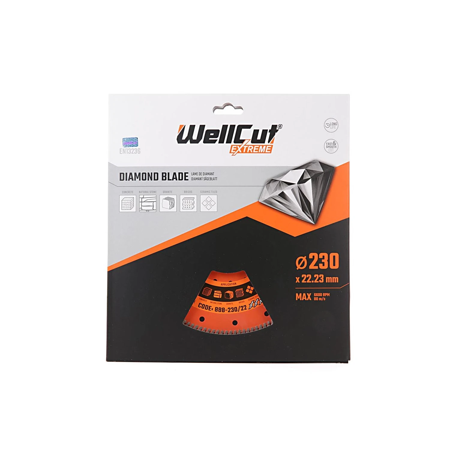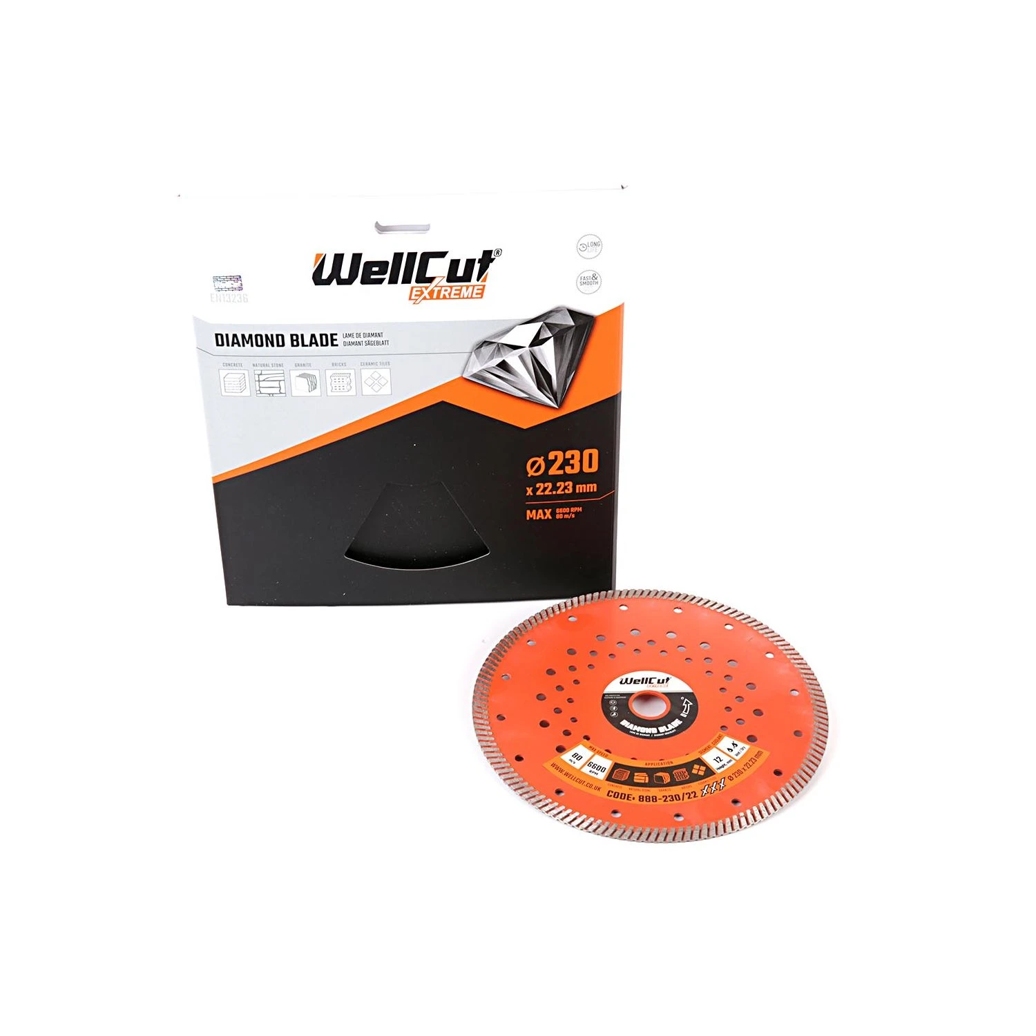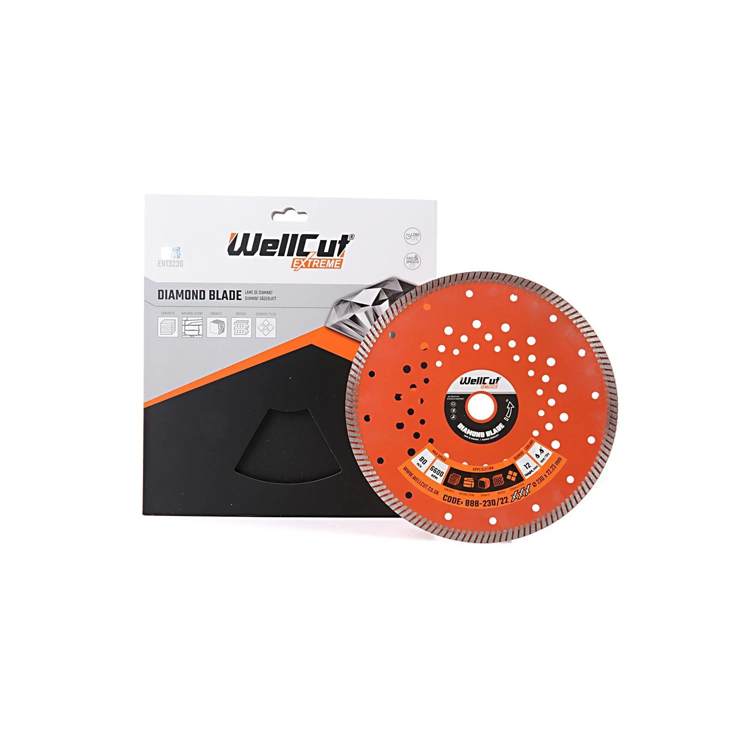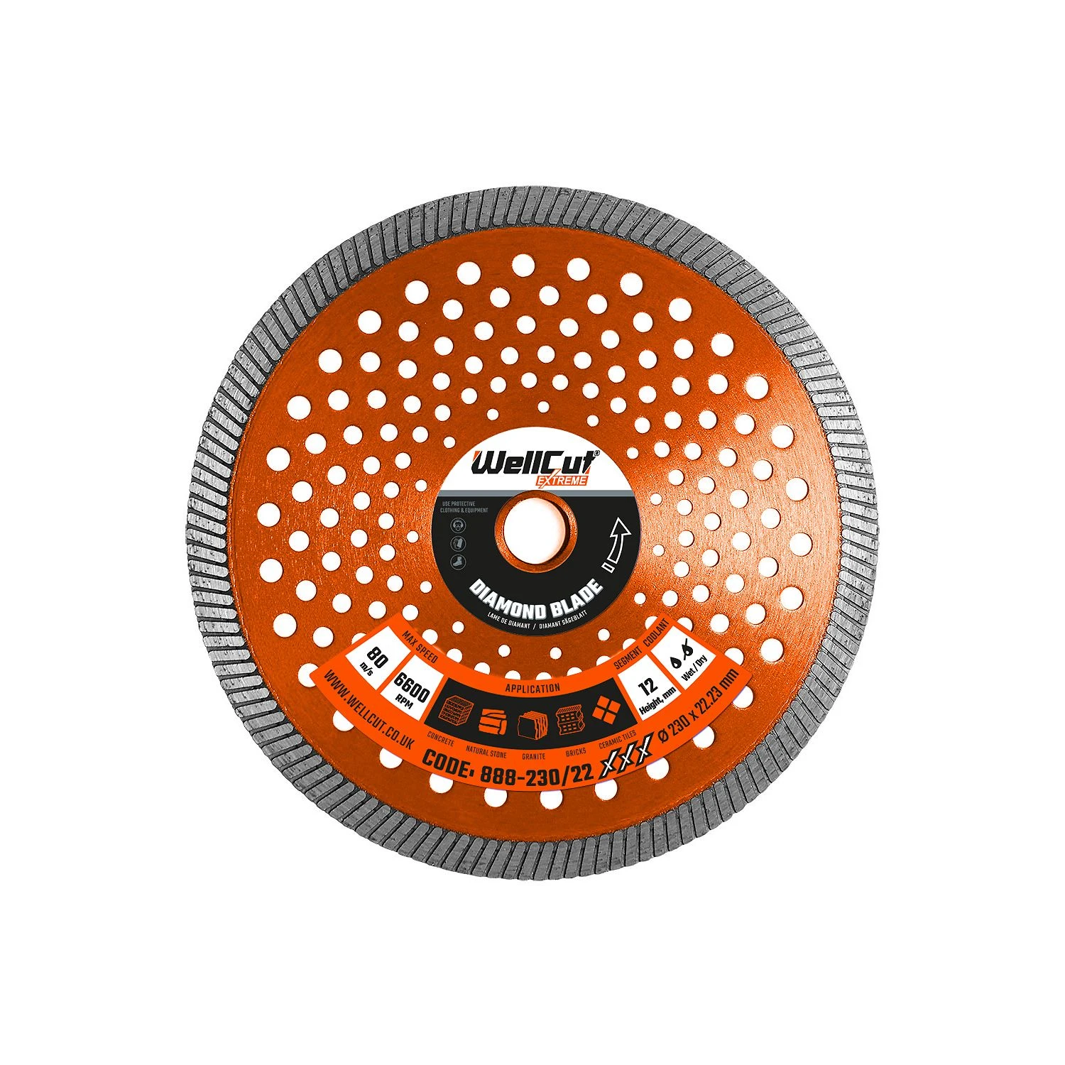 Next time you’re using your angle grinder or petrol disc cutter to cut through concrete, natural stone, granite, brick tiles, or ceramic tiles, make sure that you’ve got a top-spec, multi-purpose, professional-grade diamond blade to go with it: The 888-230/22 diamond blade from WellCut®’s Extreme series. The 888-230/22 diamond blade is especially hard-wearing, thanks to its hot-pressed turbo segment design, providing fast, precise cuts, as well as its thick coating of manufactured diamonds on the blade’s cutting surface. You can use the 888-230/22 diamond blade for dry or wet cutting: Using a diamond blade when wet helps to prevent it from overheating and also minimises dust for a cleaner cut. And because the blade can be used for a variety of purposes, it comes at a great value, too. The diamond disc cutting blade angle grinder is designed to fit all major brands of angle grinders, including the DeWalt angle grinder, Makita angle grinder, or the Milwaukee angle grinder, making it an excellent choice for versatility. And get this: WellCut®’s diamond blade has a pattern of round holes for reduced noise and vibration and more stable operation, so that’ll be good news for the neighbours. So, whether you’re a builder, a bathroom fitter, or a kitchen fitter, invest in the best with the 888-230/22 diamond blade from WellCut®.