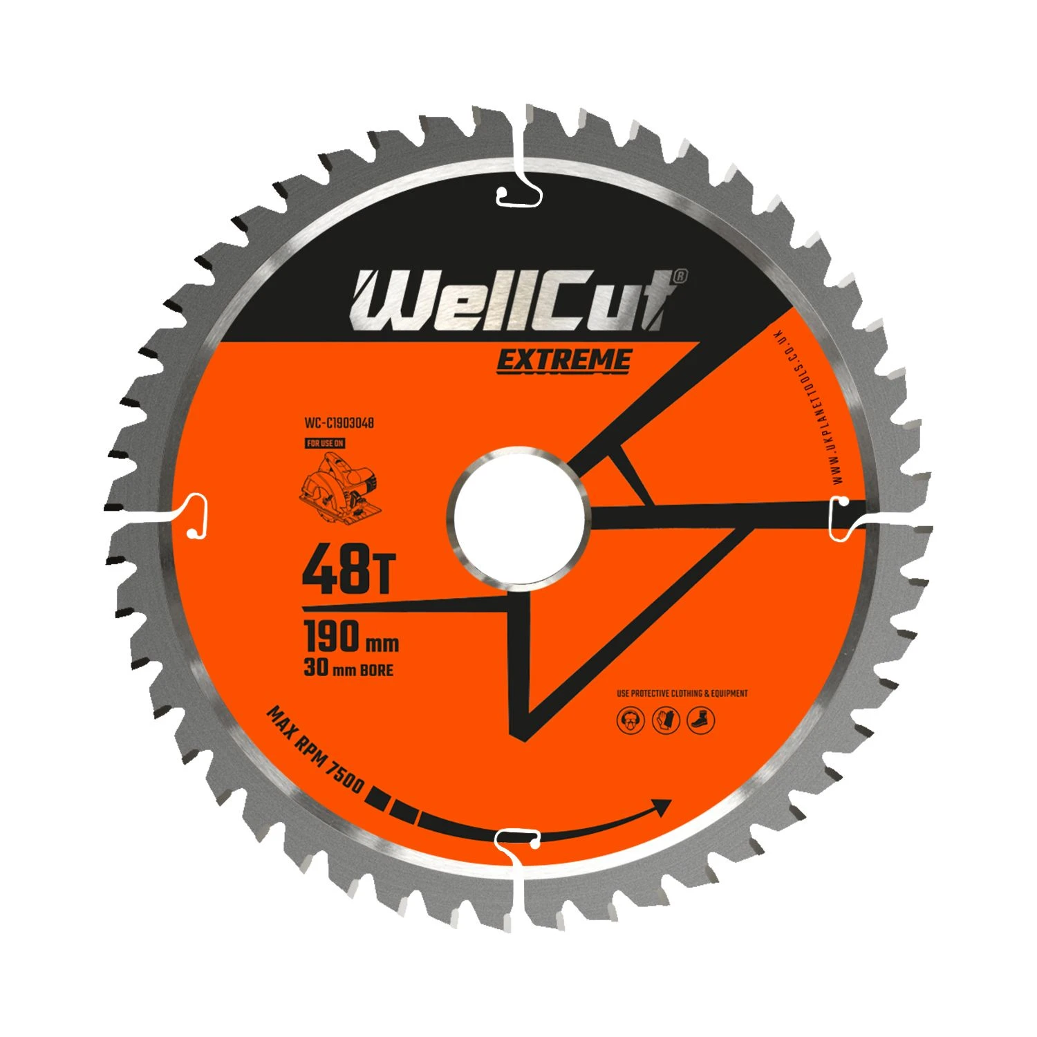 WellCut® 48T, 30mm Bore Extreme Circular Saw Blade is the accessory you need for your circular saws. The sharp saw blade is designed with an Alternate Top Bevel tooth shape, suitable for general purpose cutting of various materials, including hardwood, softwood, particle board, and Medium Density Fiberboard (MDF). With an impressive 48 Teeth, this wood cutting circular saw blade is recommended for both rip and cross-cutting. Not only this, its laser-cut body will ensure you get accurate and straight cuts. This tool accessory will keep its quality when maintained with your favourite circular saw blade sharpener, making it last for years to come. What’s more, this essential product is made of premium tungsten carbide teeth with a 17° positive rake angle for increased durability and standard of performance. This saw blade is ideal for use with a variety of different professional circular saw tools, including cordless circular saws. Use it with your Makita circular saw, your DeWalt Circular saw, your Bosch circular saw, and many more well-known brands of circular saws.