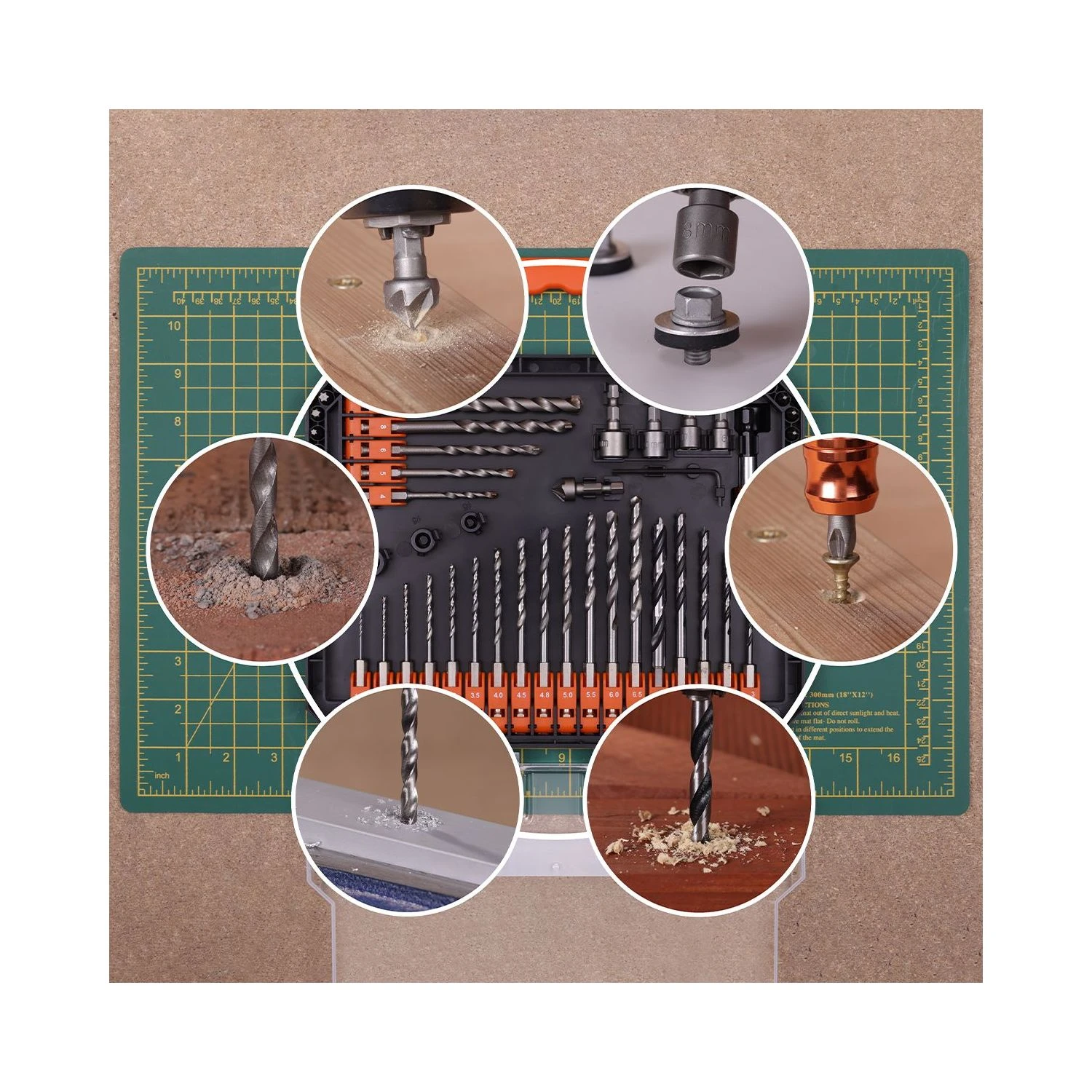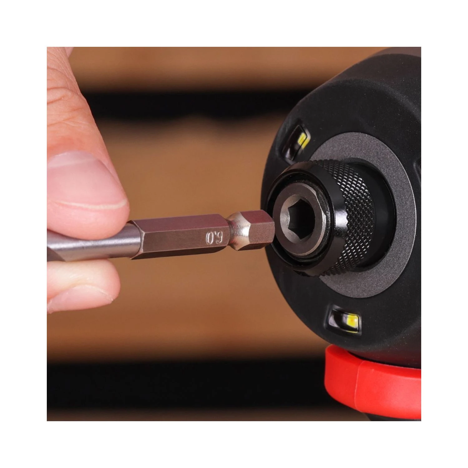 - Hex shank bit set – The flat surfaces on a hex shank allow the chuck to grip the drill bit more securely. This provides a more accurate and efficient drilling experience.