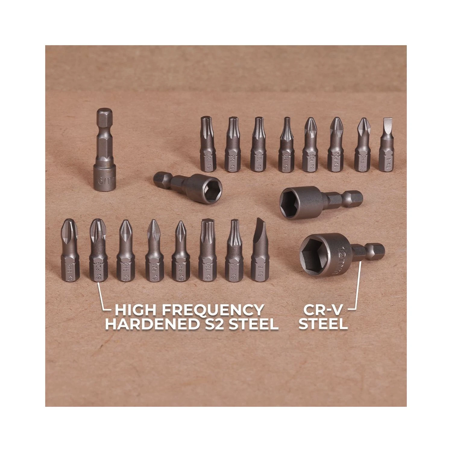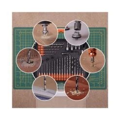 Full hex shank drill & screwdriver bit set by WellCut comes with 49 of the most used accessory bit types and sizes. Comes with 13pcs hex shank HSS-G 4341 drill bits, 5pcs hex shank masonry drill bits, 5pcs hex shank wood drill bits, 3pcs drill stopper, 1pcs hex key, 1pcs countersink, 1pcs quick change bits holder, 4pcs nut driver, 16pcs 25mm screwdriver bits. The set is rated at hardness HRC 60-62, built from high strength fortified Steel making them ideal for hard material drilling. Split point tips allow for reduced cam-out & wobble. Built for speed and efficiency on most common drilling requirements.